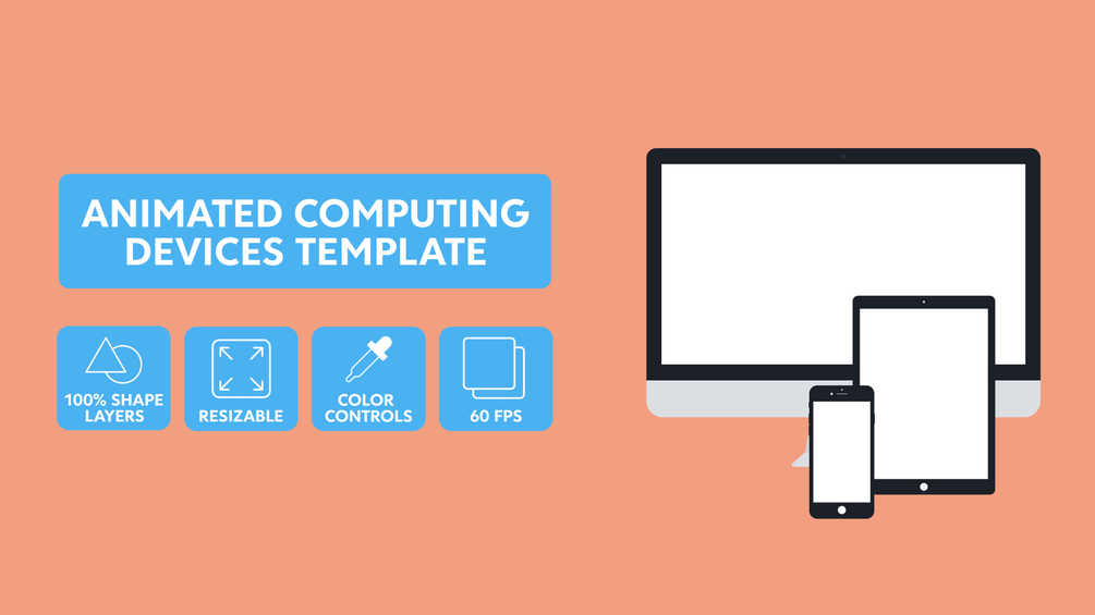 This template contains 38 animated devices: smartphones, tablets, Laptops, Desktops, iMacs, iPhones, iPads, and MacBooks.